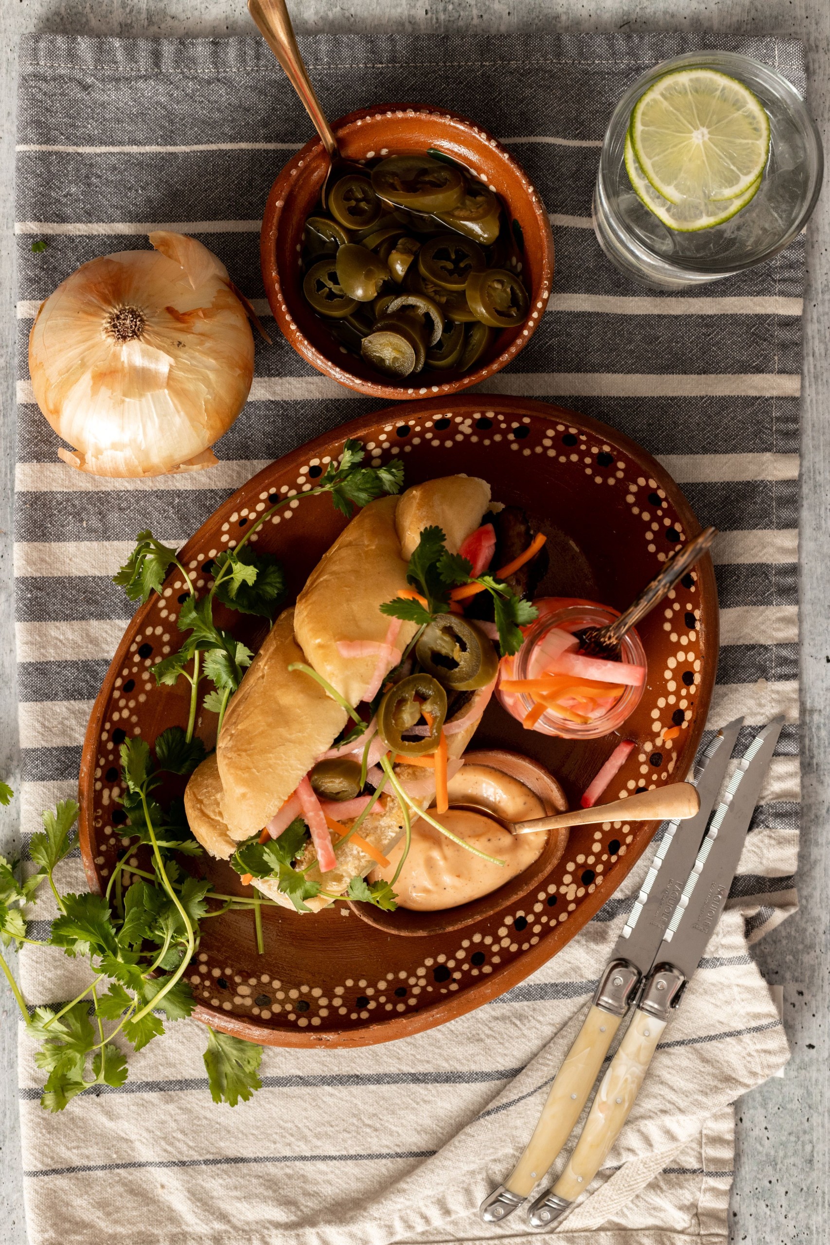 A quick pickling of onions, radishes and carrots seasoned with coriander makes for a crunchy layer in my brisket Bahn mi. thick slices of brisket, sriracha-mayo and plenty of pickled jalapenos create one tasty bite.